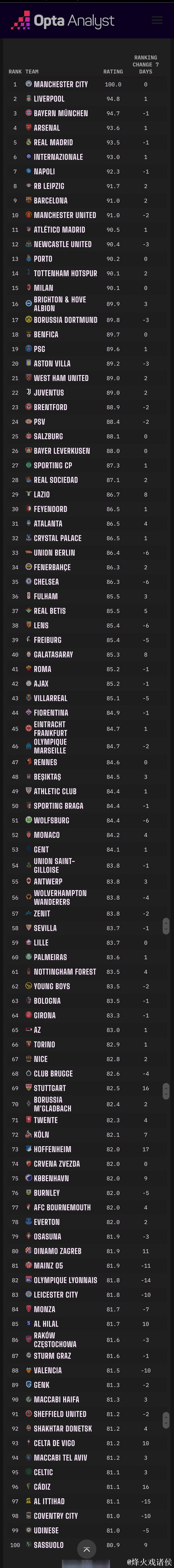 Opta全球俱乐部实力排名:阿森纳领衔,拜仁、巴黎上榜